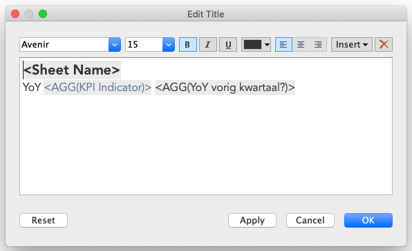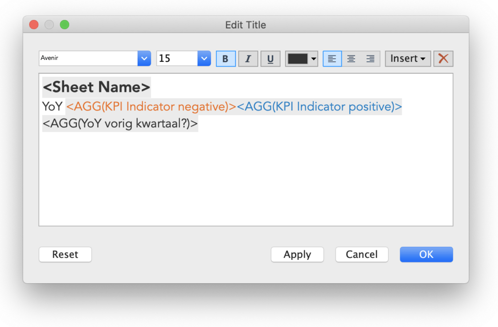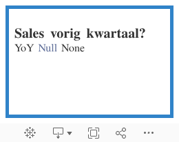 In deze blog is te lezen hoe je een KPI indicator maakt, in dit geval hebben we dit gedaan voor de Year over Year (YoY). Deze kan nu ingezet worden om bijvoorbeeld de titel aan te passen. De KPI Indicator heb ik paars gekleurd, ik zal dus of en paars pijltje omhoog krijgen, of een paars pijltje naar beneden.