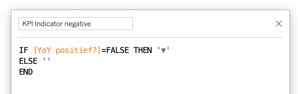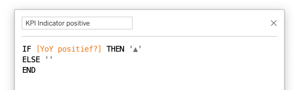 Wat je nu kunt doen is de positieve KPI indicator blauw, en de negative KPI indicator oranje kleuren. In het voorbeeld is de KPI indicator positief, het pijltje omhoog ▲ zal blauw gekleurd worden. Omdat de KPI indicator niet negatief is, zal de oranje gekleurde [KPI Indicator negative] “” (niets) worden weergegeven, je ziet dus niets.