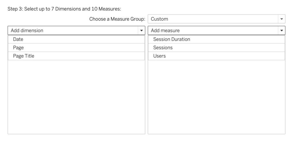 De eerste stap is een connectie maken met Google Analytics, en de juiste velden kiezen. Niet alle metrics kunnen met elkaar gecombineerd worden, je kan maximaal 7 dimensies en 10 measures kiezen. In dit geval kiezen we voor Date, Page en Page title. In het voorbeeld maken we gebruik van Sessions. De tijdsperiode kun je ook instellen op bijvoorbeeld een week.