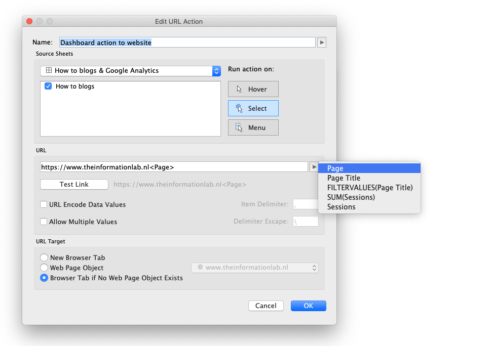 Dan kies je de source sheet, in mijn geval de ‘How to blogs’. Dan kies je de url, in mijn geval https://www.theinformationlab.nl. Let op dat je https:// gebruikt. Dan druk je op het pijltje rechts bij URL en kies je voor Page. Dit is de Page die we eerder op detail geplaatst hebben in de sheet. Als je dit niet hebt gedaan, zul je dit veld hier ook niet tussen zien staan. Je zult nu zien dat de url aangevuld is met <Page>.