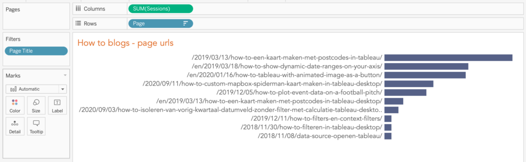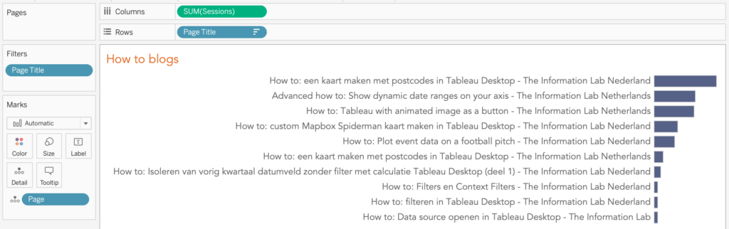 Persoonlijk vind ik dit niet erg leesbaar, dus kies ik er voor Page te vervangen met Page Title op Rows. Page sleep ik wel naar Detail op de marks shelf, waarom dit nodig is kom ik later op terug.
