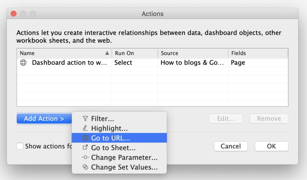 Om nu de pagina titels interactief te maken en de betreffende webpagina te tonen maken we gebruik van een dashboard action. Ga naar Dashboard > Actions. Vervolgen kies je voor Add Action > Go to URL: