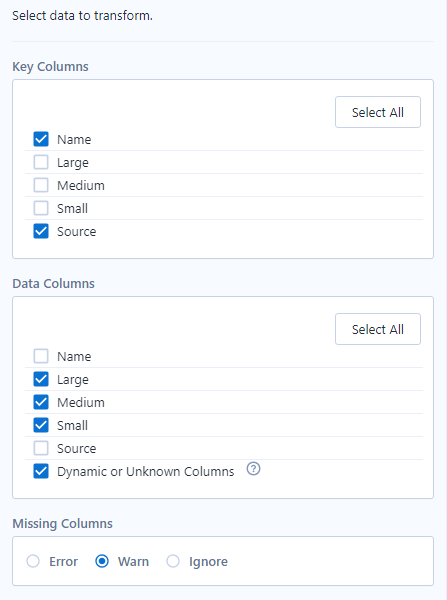 - choose the newly pivoted “Name2” columns under Change Column Headers, so as to restore “Large”, “Medium” and “Small” as headers;
