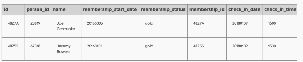Now that we have found the person ids, we can query the facebook_event_checkin table, and join it with the person table in order to obtain the person’s name as well as their id: