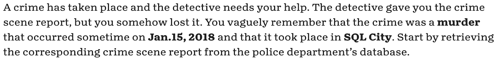 Are you new to SQL? Or maybe you have some experience but you would still like to practice some more? There is no better way to learn than by having fun. This week, I’d like to recommend “The SQL Murder Mystery”, an SQL challenge designed by The Knight Lab of Northwestern University.