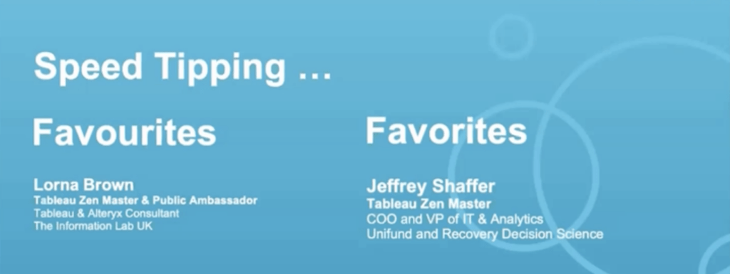 If you like Tips & Tricks sessions you will like Speed Tipping Favourites. In this session you will learn many how-to secrets to bring your Tableau skills to the next level.