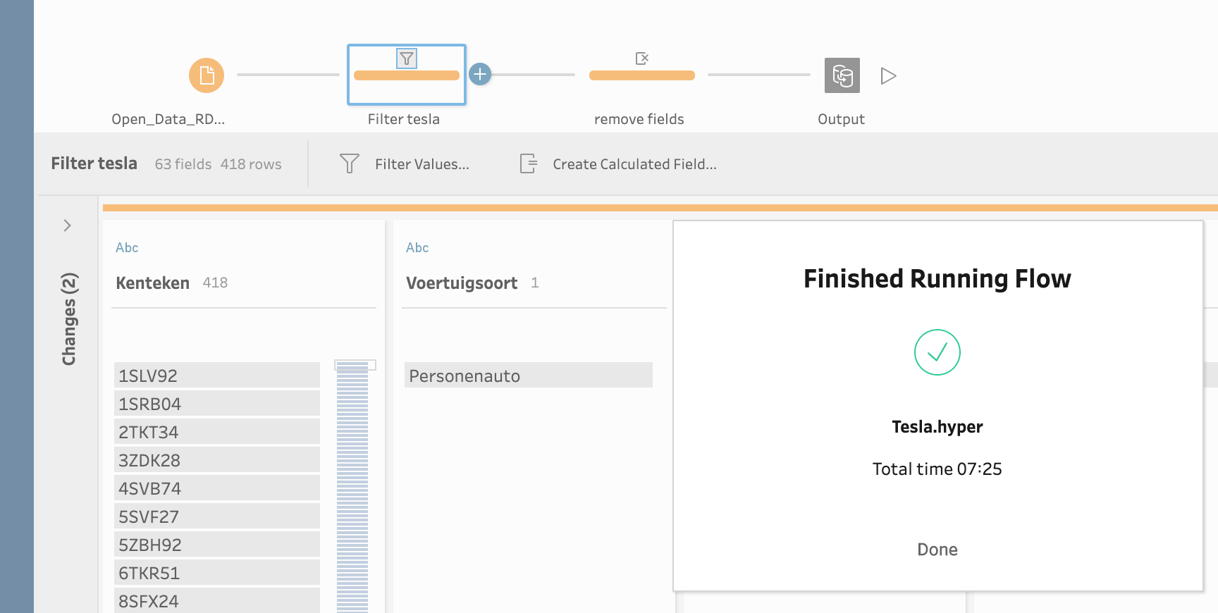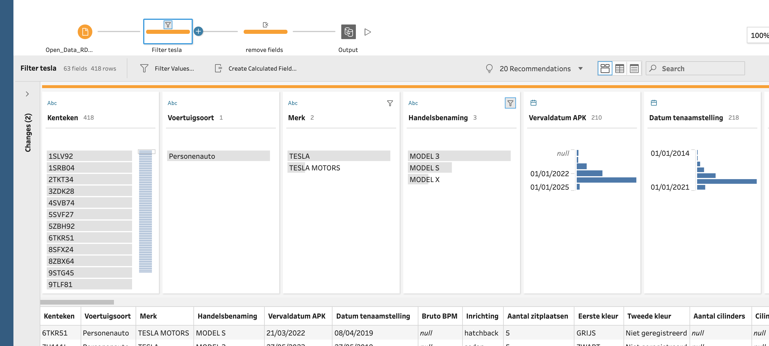 Voordat we het bestand gebruiken in een visualisatie, gaan we dit eerst bewerken (zo gaat dit met de meeste projecten). Hiervoor gebruik ik Tableau Prep, wat standaard geleverd wordt in een Tableau Creator licentie. In Prep maak ik een koppeling naar het CSV bestand door deze heel eenvoudig in de Flow te slepen. Vervolgens maak je een nieuwe stap in de Flow en selecteren we alleen het merk Tesla en Tesla Motors. Het bestand zal nu in ieder geval een stuk kleiner worden met alleen relevante data.