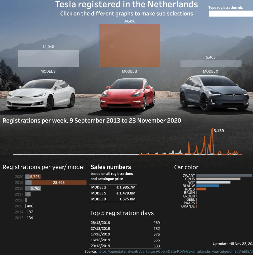 Nu hoef je alleen nog maar de grafieken op de juiste plaatst te zetten. Dit kan met optie Floating en met Containers. Ik heb bv de bar chart die je hierboven ziet, heel breed gemaakt en boven de 3 Tesla’s in de foto gezet, zodat je meteen weet hoe het model er uit ziet.