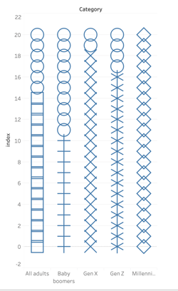What is going on here? As you might notice, each category has a different shape, except for the circles at the top of the bar. The different shapes represent the actual value of that category, whereas the circles at the top are there to fill up the bar as much as the category with the highest value.