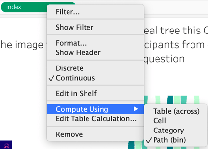 Drag Index to rows and (here is where we start using our Path (bin) field!) right click on the Index pill and select Compute using → Path (bin)