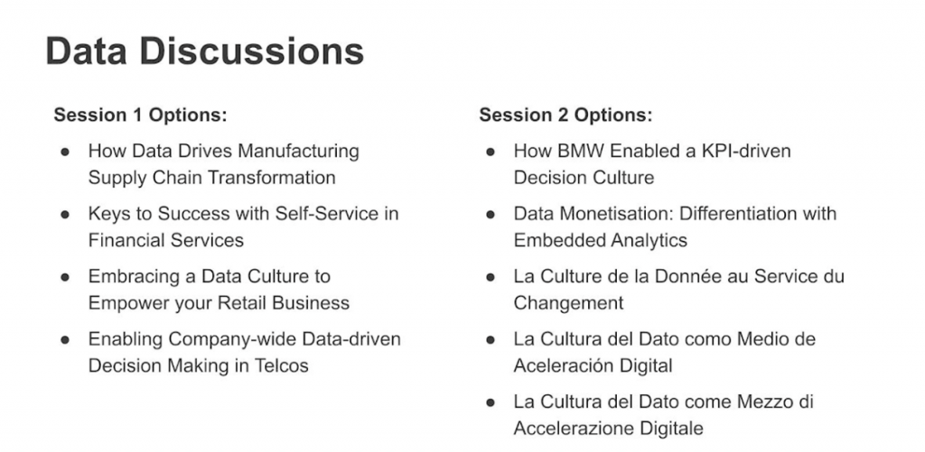 Vervolgens zijn er break out sessies, met drie verschillende “tracks”, namelijk: What’s new in Tableau (2021.1), Data-Driven Innovation .& Data Skills for All.