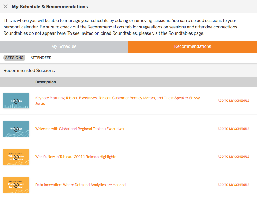 Vergeet niet je profiel aan te vullen met een foto en een bio, zo kun je gemakkelijk mensen terugvinden met hetzelfde interessegebied. Ook kun je een foto maken in de photoboot, en deze delen op je sociale netwerken. Gebruik dan de hashtag #TableauLive21. Wanneer je je interesses invult, zul je aanbevelingen krijgen om je schema verder op te bouwen.