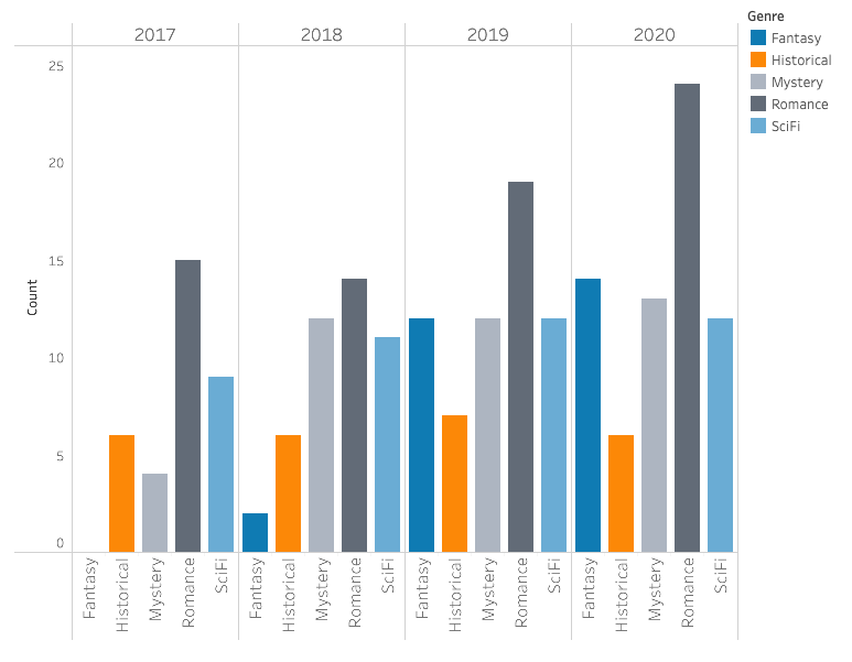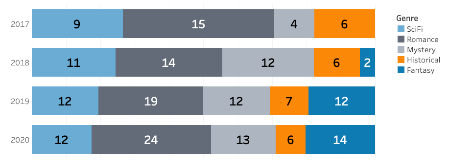 That’s a lot of bars! Even so, a bar chart makes individual comparisons easy. I can tell that in 2019, my inventory had a lot more Romance novels than Historical novels, and that the number of Historical novels does not really differ from year to year. I might even spot some trends: it looks like the bars on the right are higher, so probably the number of books increased over the years.