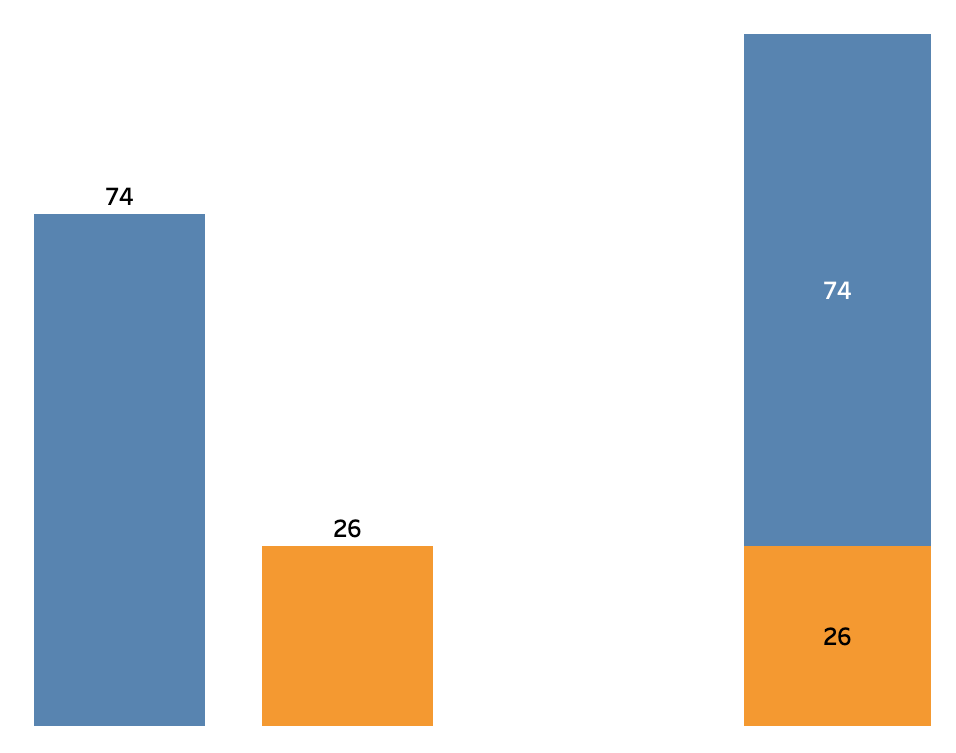 Couldn’t I get all that from the simple bar chart? Sure! But my brain had to do some work to get there. The visualisation only showed the parts. To answer the question I had to know that these were the only two parts, and I had to imagine what the whole would be, by mentally stacking the two bars on top of each other. The whole was nowhere to be found on the visualisation itself.