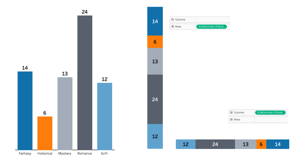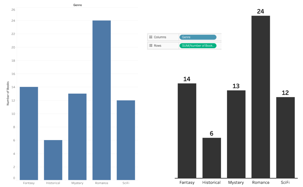 We started out last time by creating a simple bar chart and converting it into a stacked bar chart. You don’t have to create a simple bar chart first, but we might as well — we’ll have two charts for the price of one! Creating a bar chart in Tableau is very fast. We simply drag a dimension (Genre) onto Columns and a measure (Number of Books) onto Rows…