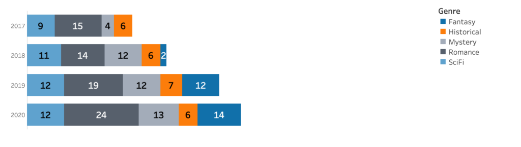 Hmm. We are seeing parts-of-wholes all right, but all the wholes are different sizes? Note that the bars represent the number of books, which increases every year. If I’m interested in seeing the relative distribution of genres, this would be so much easier if every year were the same size. To make every year the same size, we need a way to express the total that stays constant over the years. We can get this by converting our measure to a percentage of total. Every year, all books will add up to 100% of all books that year – the whole remains the same.