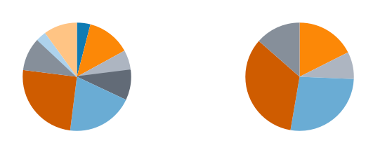 It’s just too much, right? The chart is very difficult to read and interpret. Try to limit the number of categories to 4-5. The chart on the right is much more doable.