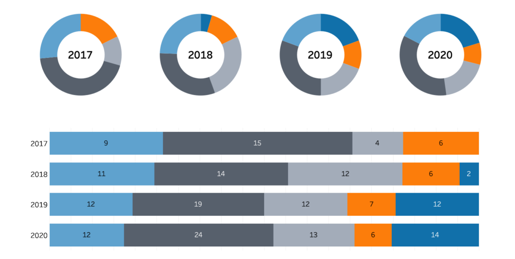 Pie charts are also not great at showing trends, for the same reason they are bad at showing comparisons – without a good sense of the size of the parts, it’s hard to see how those parts changed over time. Have a look at these donuts and our stacked bar charts, representing the same data. Which chart makes it easier to see the evolution of genres over time?