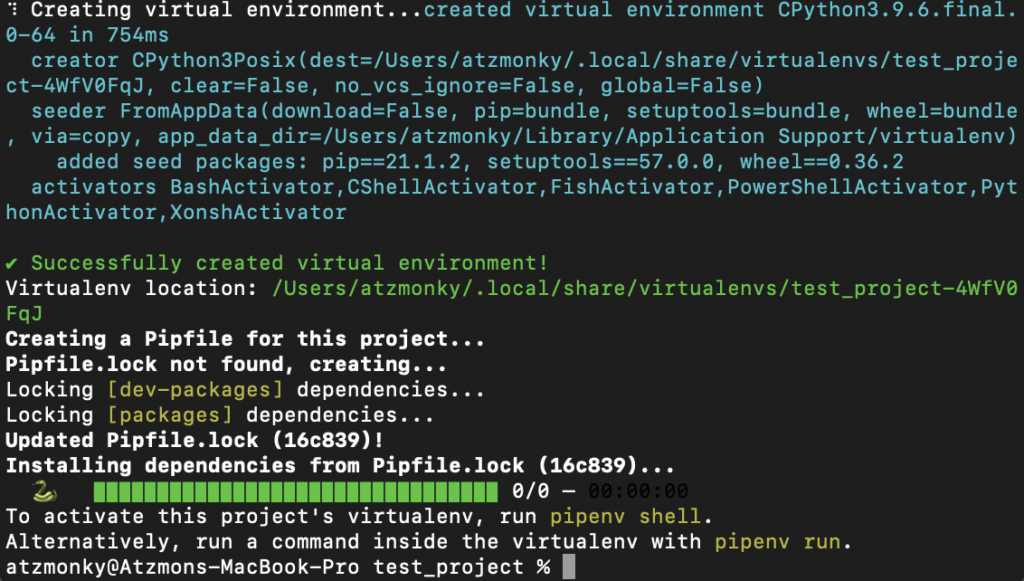 The last command has created a virtual environment for python version 3.9.6 using /Users/atzmonky/.pyenv/versions/3.9.6/bin/python3.9 (3.9.6) and will look like this: