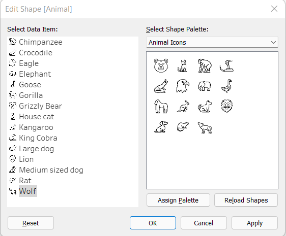 - In the pop-up menu, first click “Reload Shapes” then select your shape palette (in my case I named it Animal Icons).