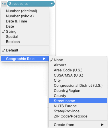 Now that we have imported the new Geocoding information, it is time to put it to work. Remember the Excel file we started with? We can now use the street adres column as a spatial column. We have to assign it with our new geographic role. First, select the column you want to assign a geographic role. Then, click the ‘abc’ icon, move down to Geographic Role and select your newly created role: Street name. Tableau will now try to match the text in the street adres column with its updated Geocoding Database. Now you can create maps with your stores!