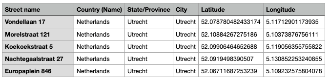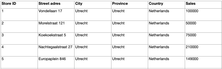 First, let’s take a small step back. What would be a good use case for custom geocoding? Imagine you have an Excel file. This file contains store locations. The Excel file contains a column for the country, city and street name of each store. As you can see below, we do not have any latitude or longitude to create a map containing store locations. Let’s load this file in Tableau Desktop.