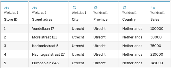 As we can see in Tableau, the columns City, Province and Country are marked as spatial columns. This is indicated by the globe symbol. In Tableau, we can create maps using these spatial columns. Tableau automatically recognises cities, province, countries and even postal code areas. But what about our store locations? This is where custom geocoding comes in. We can add spatial locations to Tableau, like our store locations. That way, anytime we connect to our store data, Tableau knows this is a spatial column as well. This allows us to also create maps using the store locations.
