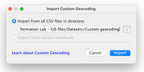 Tableau will then import the new Geocoding file. The information in this file will be added to the Geocoding Database that is stored in Tableau. You are now ready for the final step.