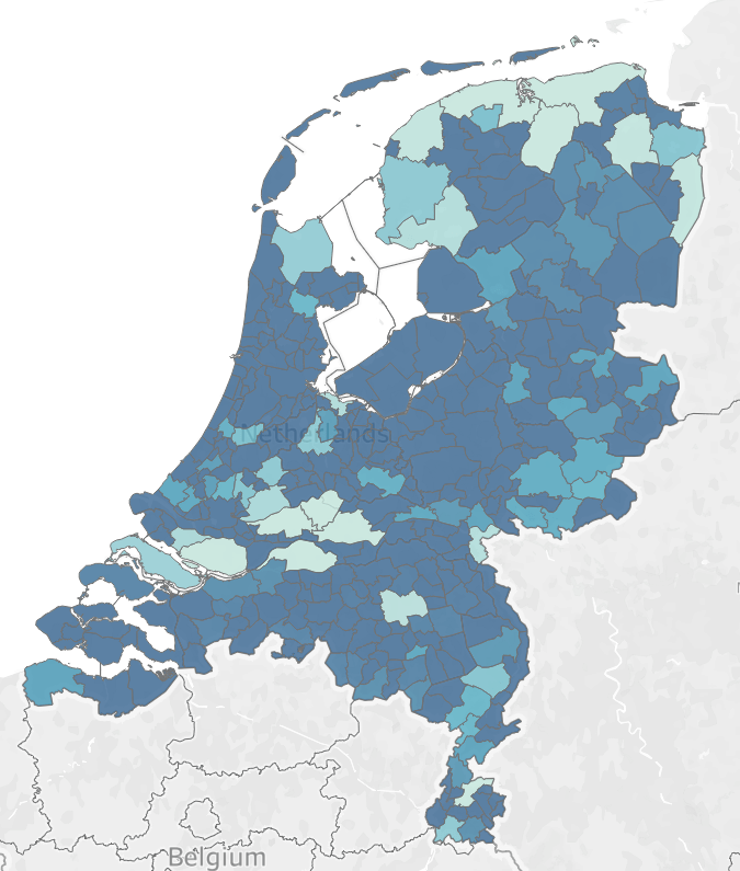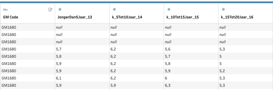 I use the pivot function in Tableau Prep for this. This works super smooth. The result is a long table. Each row contains the percentage for 1 year, 1 age group and 1 municipality. After Tableau Prep, this is what the table looks like. Do you notice the difference? I then join this new table to the municipalities shape from the CBS.