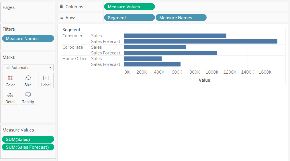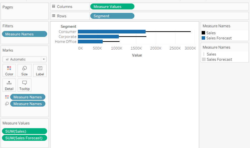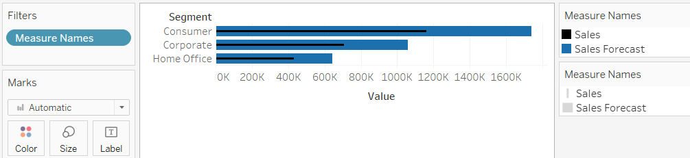 We kunnen nu de verkoop voorspellingen zien in de grafiek, echter zijn de Sales en Forecast in columns gecombineerd tot Measure Values. Daarnaast is Measure Names nu te zien bij rows en bij Filters. De Sales as heet nu Value.
