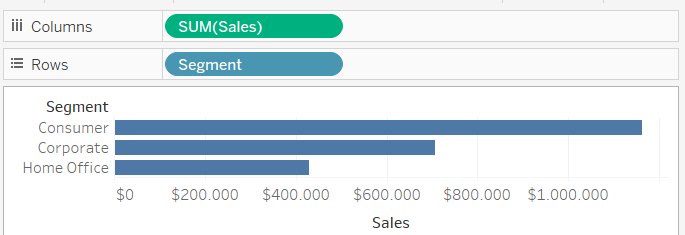Ik wil hier de voorspellingen van de verkopen met de werkelijke verkopen vergelijken en doe dit voor verschillende segmenten. Als eerste begin ik met het maken van een normale staafgrafiek van de verkopen over de segmenten. Hierna sleep ik Segment naar rows en Sales naar columns.