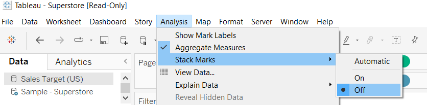 Als laatste stap verander ik Stack Marks naar Off via Analysis, hierdoor worden de twee staven over elkaar geplot.