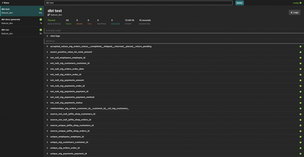 Zeker zijn van accurate en huidige data is altijd een groot goed maar niet altijd vanzelf sprekend. Om dit te waarborgen stelt dbt je in staat om je data te testen voordat het verder in de database wordt verwerkt. Denk hierbij niet alleen maar aan de (ingebouwde!) constraint-tests of nagaan of een column geen null-waarde bevat maar ook tests die je zelf kunt schrijven ; vallen alle waarden in een column wel binnen een verwachte range ? Op deze manier kun je de Analytics Engineer in staat stellen om fout aannames of data te signaleren voordat de business er zelf last van ondervindt.