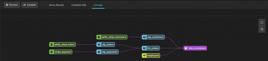 Met behulp van de eerder genoemde lineage, kan dbt ook makkelijker bepalen in welke volgorde de verschillende tabellen moeten worden opgebouwd. In het bovenstaande voorbeeld is het niet heel nuttig om dim_customers op te bouwen voordat stg_customers en fct_orders compleet zijn.
