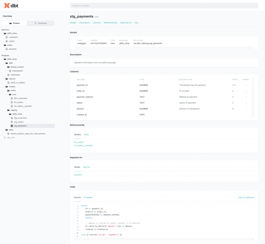 Iedereen weet hoe belangrijk accurate en uitgebreide documentatie is maar niemand heeft ooit zin (of tijd) in het maken hiervan. dbt komt daarom met een uitgebreide documentatie functie die alle tabellen en views in detail beschrijft: