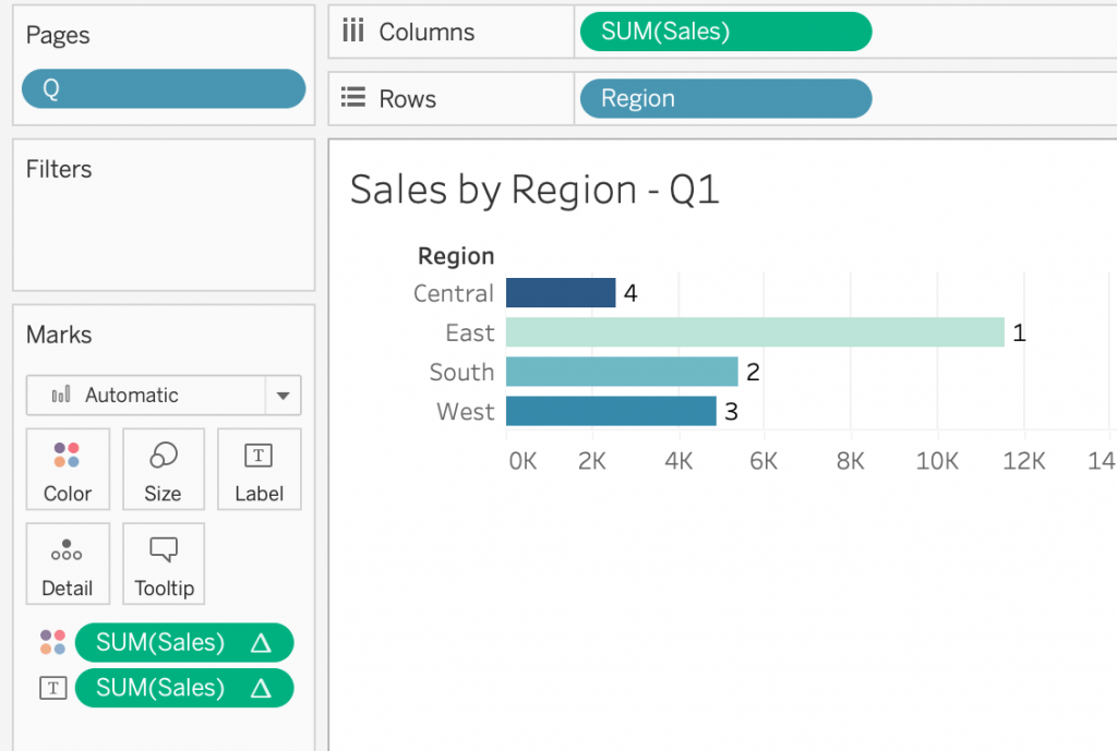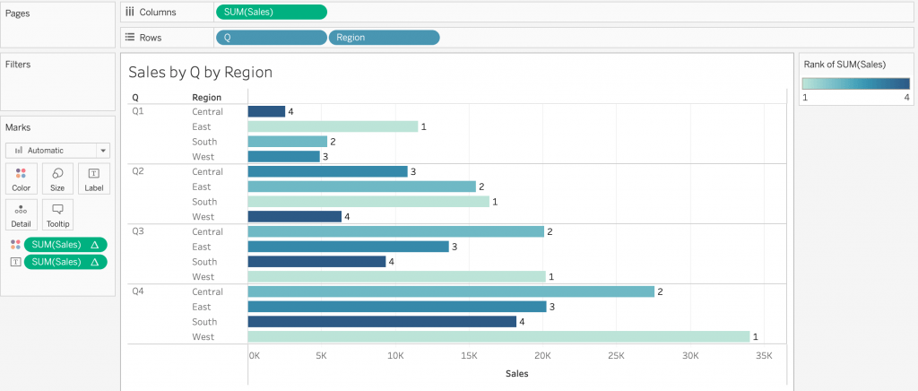Voor deze blog heb ik een visual gemaakt die sales per kwartaal per regio toont. Daarnaast is er een rangorde op basis sales, met corresponderende kleuren.