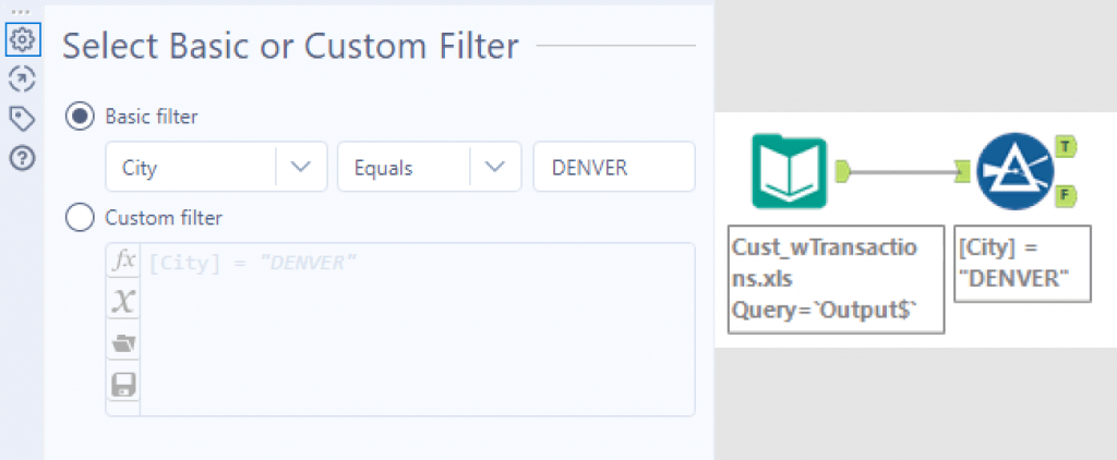 The Filter tool is another way to reduce the quantity of data not needed for your analysis. It identifies records within your dataset that matches a given formula. Therefore it is good for breaking the data apart to pass smaller amounts of information down the workflow, potentially improving performance efficiency.