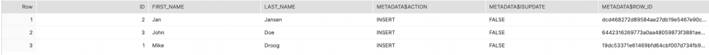We kunnen hier duidelijk de 3 nieuwe records zien , waarvan de METADATA$ACTION aangeeft dat het hier om een insert gaat.