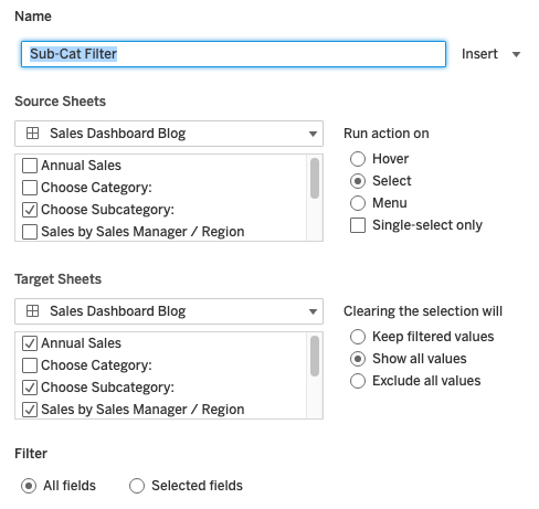 Waar je eerste de conventionele filters zag, gaan we de nieuw gemaakte worksheets plaatsen. In de rechter container dus. De ene onder de andere, in volgorde van detailniveau, groot naar klein. De ‘Choose Category’ sheet pas ik toe als filter door het trechtertje aan te klikken. De ‘Choose Subcategory’ werkt net iets anders. Ik wil namelijk niet dat die invloed heeft op zijn grote broertje ‘Choose Category’, dus ik maak een nieuwe action aan. Zie hieronder:
