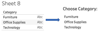 Ik maak eerst een nieuwe worksheet en zorg dat ik alleen de waarden van de dimensie ‘Category’ te zien krijg. Dit doe ik door de dimensie naar de rows shelf te slepen. Tableau zal je standaard een crosstab met waarden tonen inclusief een kolom met ‘Abc’. Verander de naam van de sheet meteen naar wat handig is, in mijn geval “Choose Category:”. Het is zaak die ‘Abc’ kolom zo goed mogelijk te verbergen, evenals alle overige overbodige opmaak. Zie het resultaat hier.