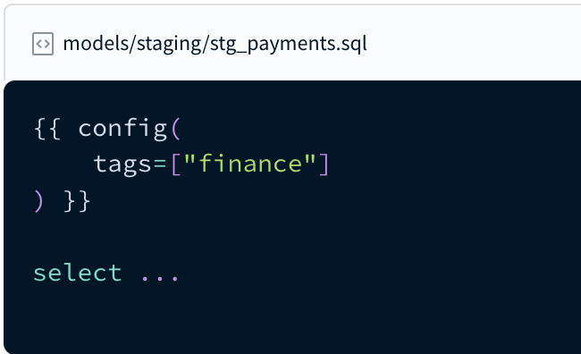 - Een andere optie is om de tags niet vanuit een centraal punt toe te passen, maar binnen een individueel model. We kunnen hiervoor de dbt ‘config’ functie gebruiken.