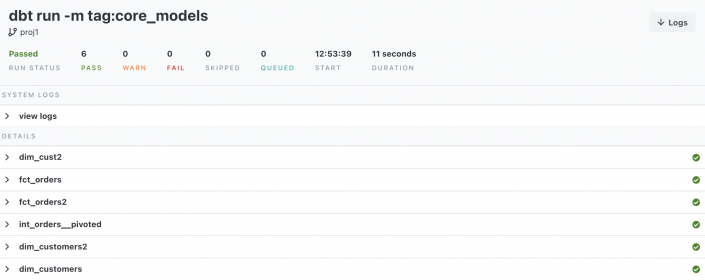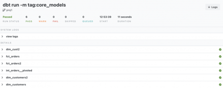 We kunnen zien dat deze modellen met succes zijn uitgevoerd in dbt: