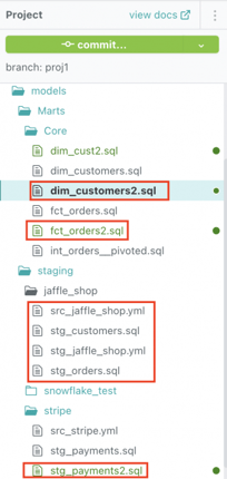 Kijkend naar onze folder-structuur in dbt, zal volgens de dependency graph hierboven, alleen de volgende modellen uitgevoerd worden (omgebouwd worden tot tabellen/views in snowflake):