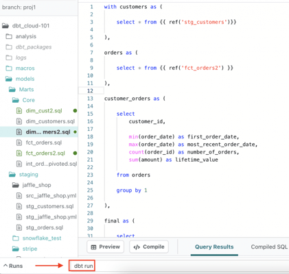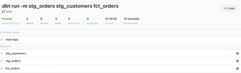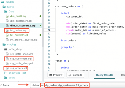 ‘dbt run -m stg_orders stg_customers fct_orders’