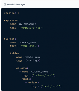 In dit geval komen dbt tags goed van pas. dbt tags kunnen worden toegepast op verschillende soorten bronnen, waaronder modellen, snapshots, seeds, sources, tabellen, kolommen en nog veel meer. We zullen hier niet verder op ingaan op al deze resources, maar ons alleen richten op de tags die worden toegepast op modellen.