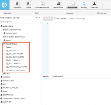 We kunnen ook zien dat de resultaten succesvol zijn uitgevoerd in onze datawarehouse, Snowflake, in het nieuwe schema: tag_schema (Snowflake geeft alle gedefinieerde namen standaard in hoofdletters).