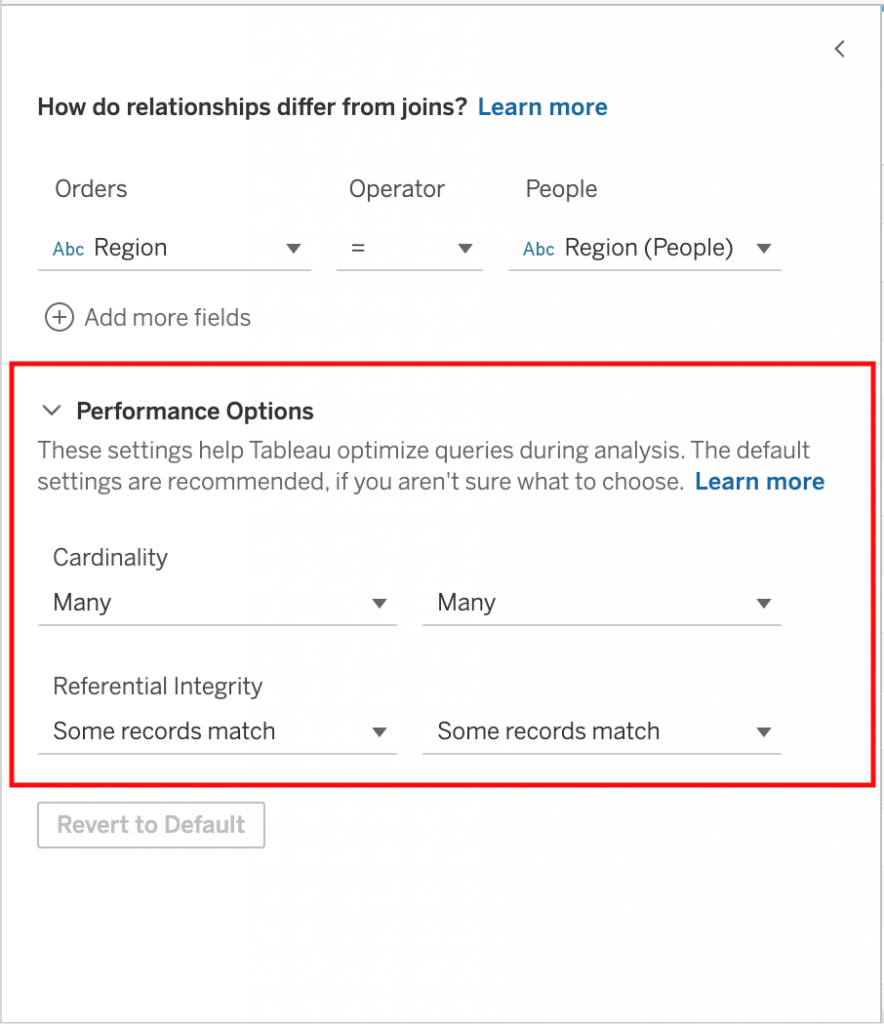 With 2020.2 release, Tableau introduced some new data model capabilities with relationships. Relationships in Tableau create Logical connections between data sources, whereas joins and unions create physical connections. This new model helps improve performance. In addition, in the configuration window of relationships, you can view performance options and configure them appropriately for your case.