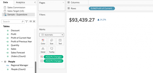 And there you go, you have created a view with a large number and comparison indicator. The percentage indicator turns orange with the arrow pointing downwards once current years profits are lower than the previous years. With these steps, you can duplicate the calculated fields and generate numbers for other measures like Sales (in case of superstore data) or with months or weeks.