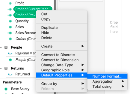 To begin creating this numbers and the percentage indicator, we need to make some calculated fields first. As mentioned before, I want the last years sum of profit and an indication of how much it went up or down from last years profit. For this I need to create 5 calculated fields: