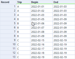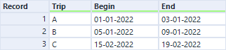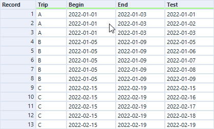 Zoals je kunt zien is er een kolom toegevoegd genaamd ‘test’. Deze heeft waardes die lopen van de begindatum tot de einddatum per trip.